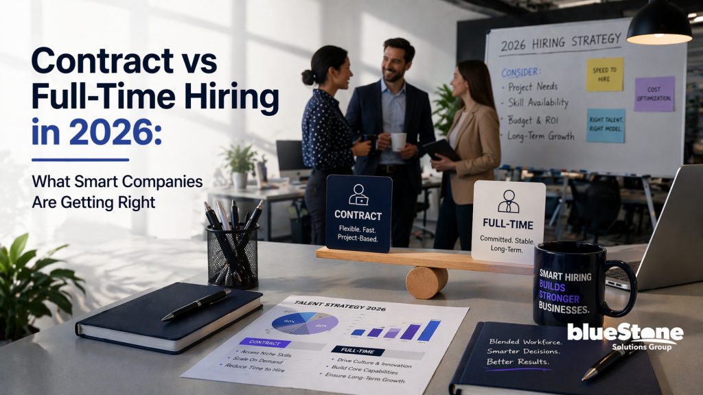 Earlier this year, a client told us something interesting: “We’re not struggling to hire—we’re struggling to decide how to hire.” And that perfectly sums up 2026. At blueStone Solutions Group, we’re seeing a clear shift. Organizations are no longer choosing between contract or full-time hiring—they’re trying to balance both to stay competitive.
